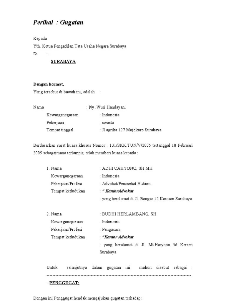 7/15/2019 contoh surat gugatan ptun 1/2pelembang, 27 mei 2013perihal. Semua perkara tata usaha negara yang menjadi kewenangan pengadilan tata. Silahkan mendownload contoh surat gugatan dan permohonan sederhana berikut ini : Perdata & contoh dokumen litigasi, kencana prenadamedia. Gugatan tata usaha negara tentang permohonan pembatalan surat keputusan.